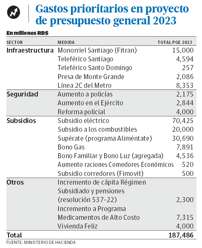Para esto ha pautado 90,425 millones de pesos solo para esos dos componentes, que representan el 48.2 % de una serie de gastos considerados prioritarios para el próximo año, en el Proyecto de Ley del Presupuesto General del Estado 2023, depositado la semana pasada en la Cámara de Diputados.